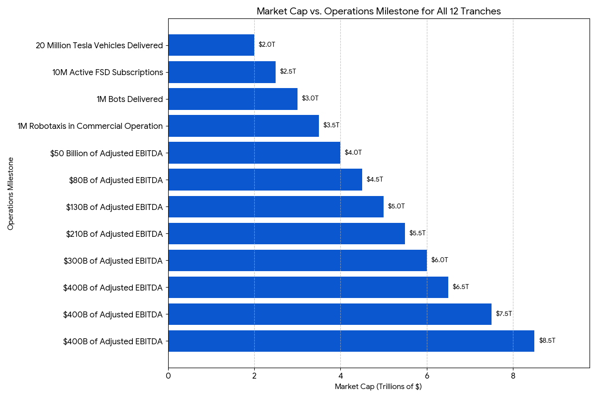 This isn’t a giveaway. It’s 100% performance-based. Musk only earns if Tesla achieves nearly impossible targets, including: