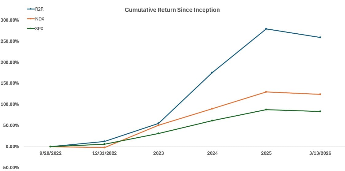| Period | R2R Return | Nasdaq 100 | S&P 500 | Net Value | Duration/Yr |