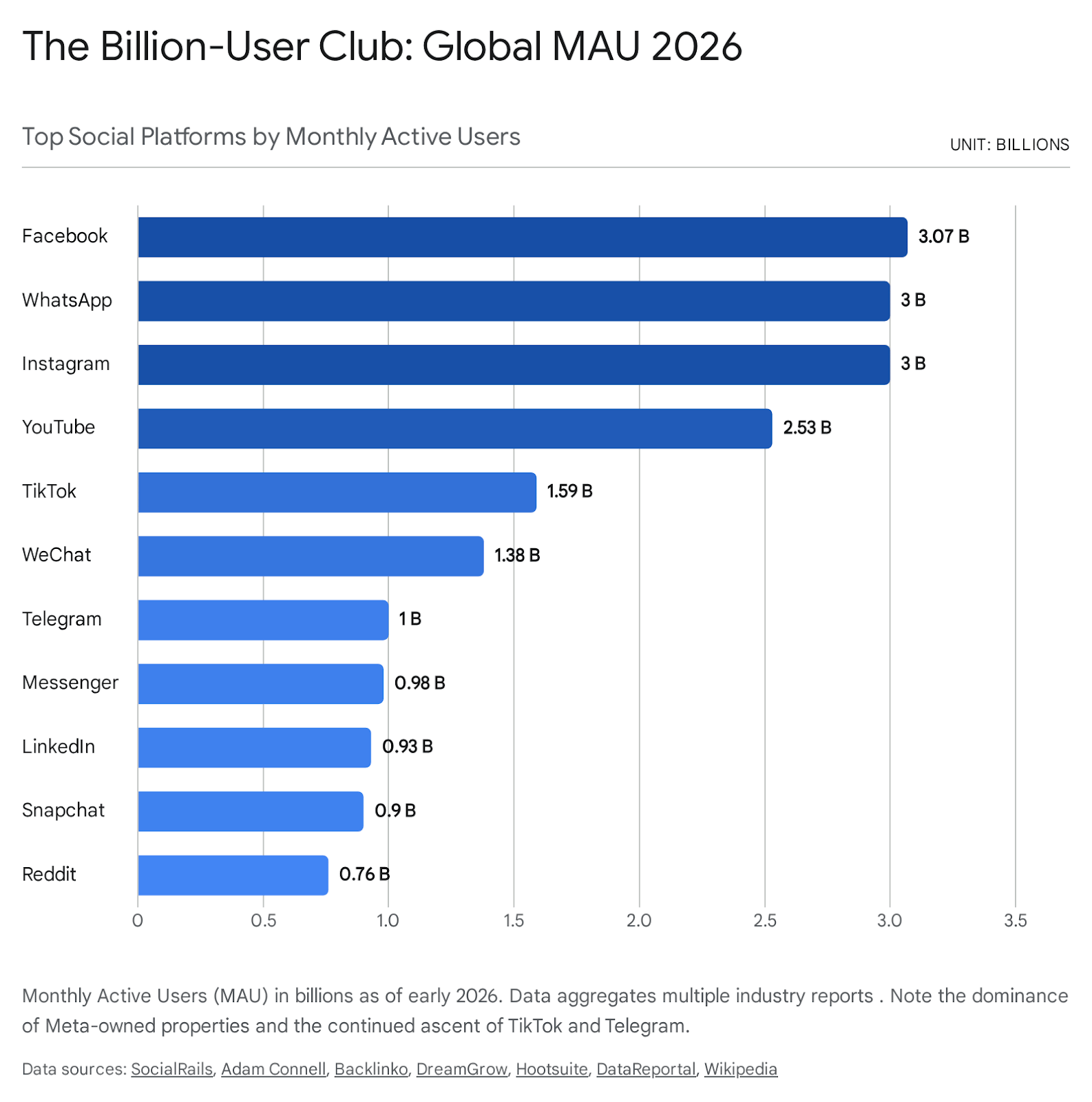 Despite a decade of predictions regarding its irrelevance to younger demographics, Facebook remains the singular most dominant platform in the world, boasting 3.07 billion monthly active users (MAU).1 It is the only platform to have effectively digitized the global directory of human identity. Its competitive advantage in 2026 lies not in cultural trendsetting—a baton long since passed to TikTok—but in its unparalleled utility for community organization and local commerce.